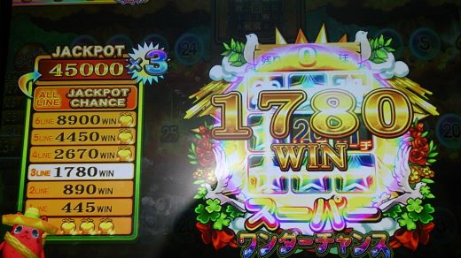 30階・40階フロアボーナスリンゴの価値が500BET以上は上がらないので効率は悪いですが、マルチモードで1000BET継続だとワンダーチャンスが50000枚近くになります(;´∀`)